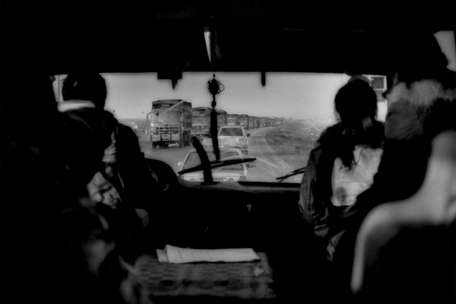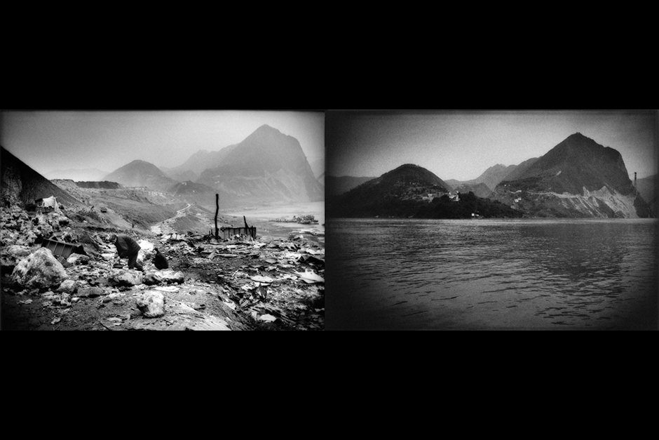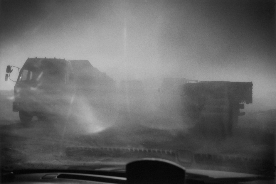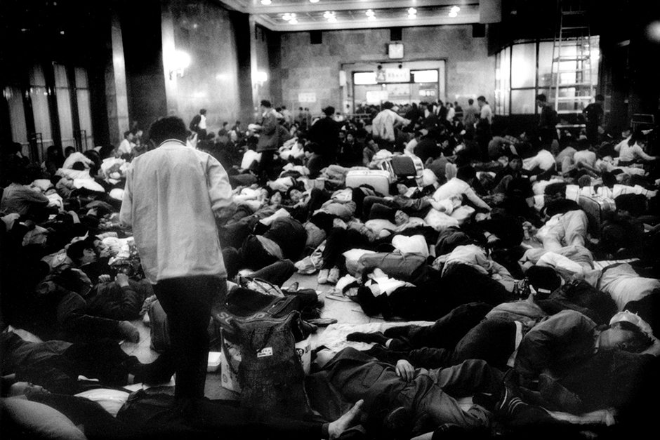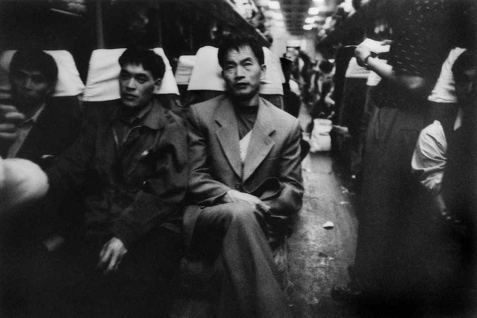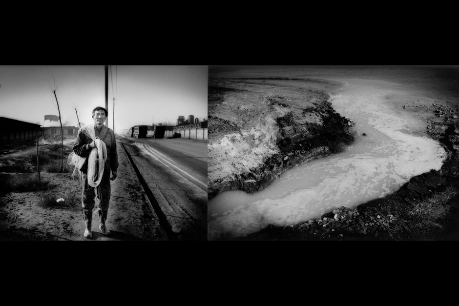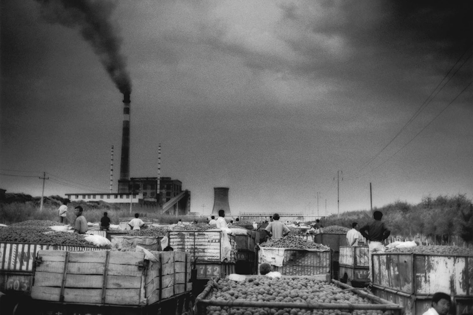 The images in his more recent series, Growth, shot mostly over the past half decade, convey a similar mood, but maintain a sharper focus. Delano has now turned his attention to the well-documented—but still hard to comprehend—consequences of China’s economic expansion. As in his past work, his sense of forboding and loss is palpable. Migrant workers asleep on the floor of the Beijing Railway Station appear eerily corpselike. A worn-out fisherman stands beside an image of the polluted river where he makes his living. Newly harvested tomatoes look as if formed from the soot that spews from a nearby smokestack, and the heads of the farmers bringing them to market are burned into the print like holes.