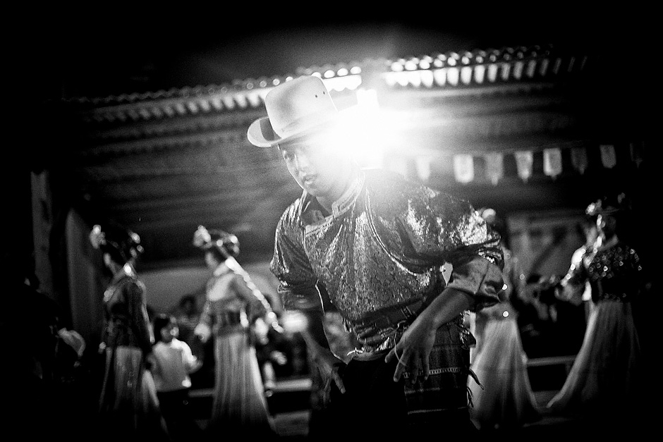 The Cauldron Fire Evening is a nightly song-and-dance session performed by the Mosuo for tourists. About thirty dancers participate and engage with the audience in traditional Mosuo folk performances. They charge thirty yuan a person and share the proceeds equally among all performers. Luoshui, Yunnan, China.