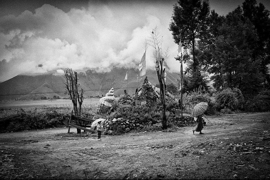 Su Na Dorje, 26, takes his two nieces up the hill to the village shrine to worship. As the maternal uncle, Su Na has to play the role of father to the two girls, Zhi Ma La Zu, 8, and Zha Xi Yi Zong, 4. In the matrilineal Mosuo culture, uncles serve as fathers to keep the family structure intact. Women rule the roost, while their brothers practice “walking marriage.” The men are not allowed to set up their own families, but instead stay within their extended families as shared father figures. Aguwa, Yunnan, China.