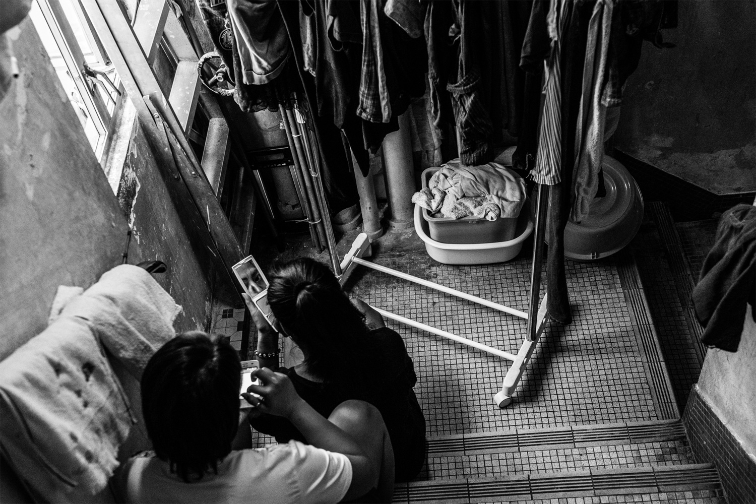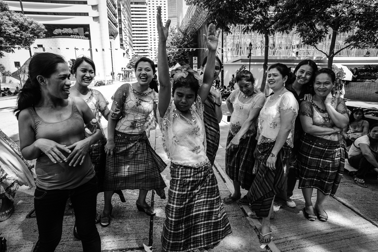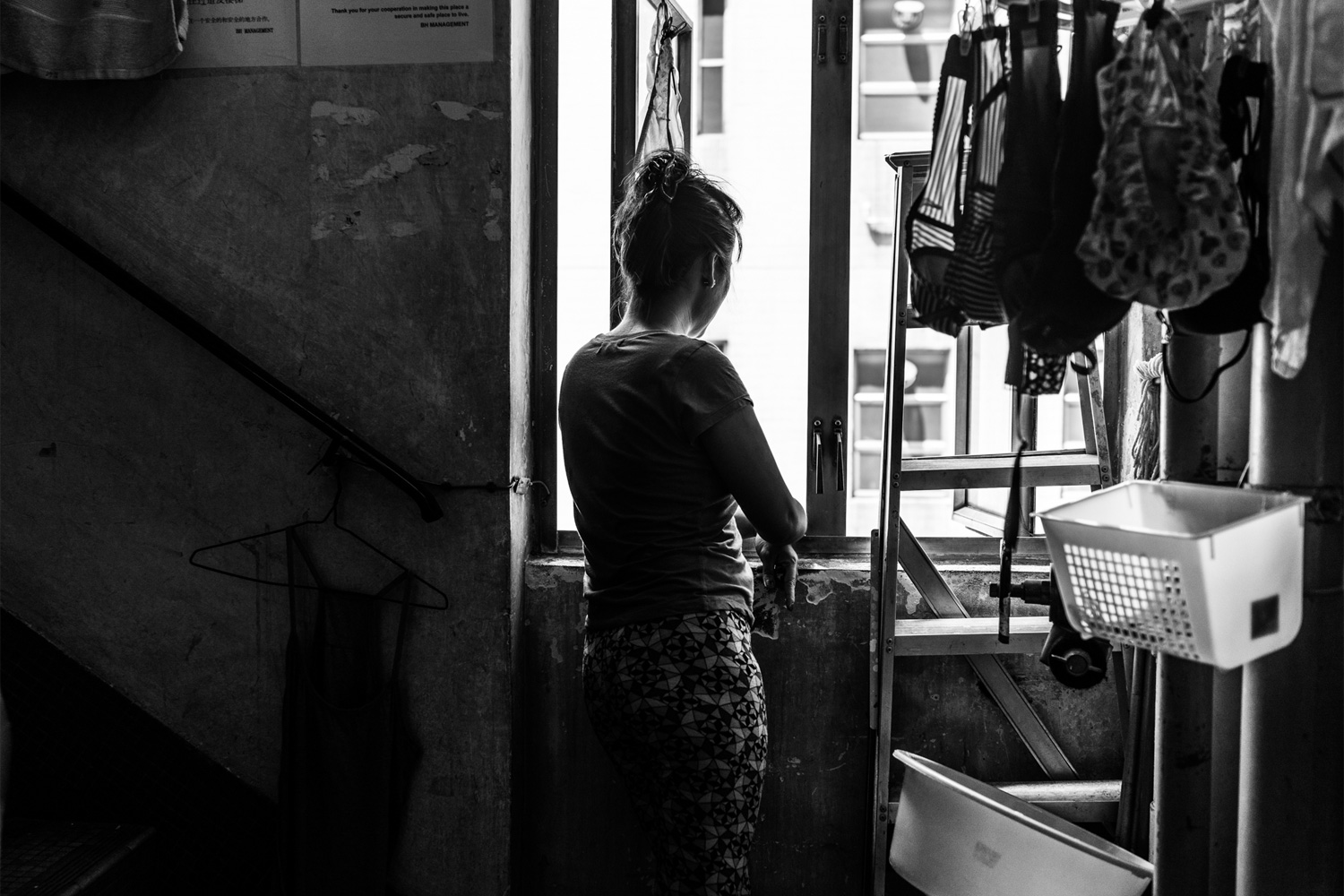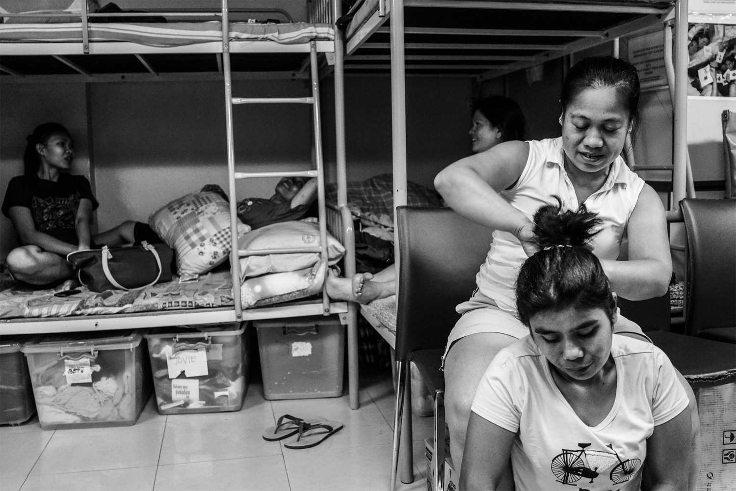 A superficially stupid comment, a harebrained remark, a look askance on Sundays and public holidays in Central and Causeway Bay, as people walk next to the huge public gatherings of Hong Kong’s “helpers” on their day off: all small marks of the conflicted relationship that Hong Kong has with the foreign domestic workers who have become indispensable to the city’s functioning. Thousands of women sitting in the streets or rehearsing dance routines—sometimes in colorful costumes, as if ready to go on stage, as in Xyza Bacani’s pictures—talking, eating, combing each other’s hair, conducting small business exchanges, exchanging information, painting their nails, packing huge quantities of stuff to send home: to the Philippines, to Indonesia, and further afield. In this territory of nearly 7.5 million people, as of December 2014, live more than 330,000 “foreign domestic helpers” who hail from the Philippines, Indonesia, Thailand, Nepal, and Sri Lanka. They have a minimum wage—but are only allowed to work in Hong Kong on contracts that bar them from gaining full residency, no matter how long they stay. They cannot apply for visas for their spouses or children, since the conditions of employment do not allow them to have “dependents”; should a family member also obtain a Hong Kong work visa, they cannot live as a family, as, by law, a foreign domestic helper must reside with her employer. And even if the rules require that the helpers have “suitable living accommodation with reasonable privacy,” in many cases the dismal size and condition of their actual quarters do not even cause a scandal anymore. Some sleep on mattresses on the floors of kitchen corridors, others in cupboards, some in the bathroom or with the children, others yet under makeshift canopies on tiny balconies.