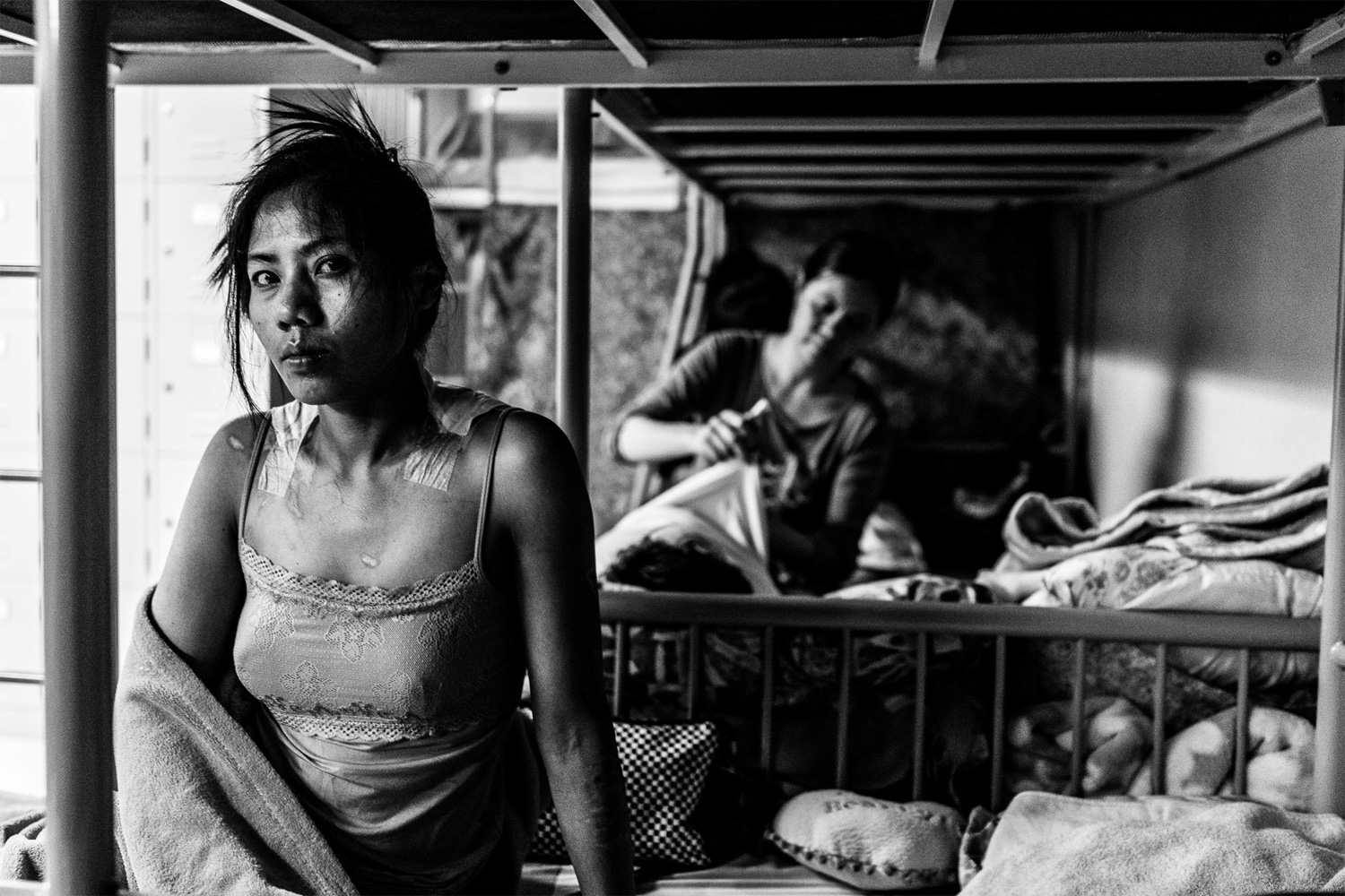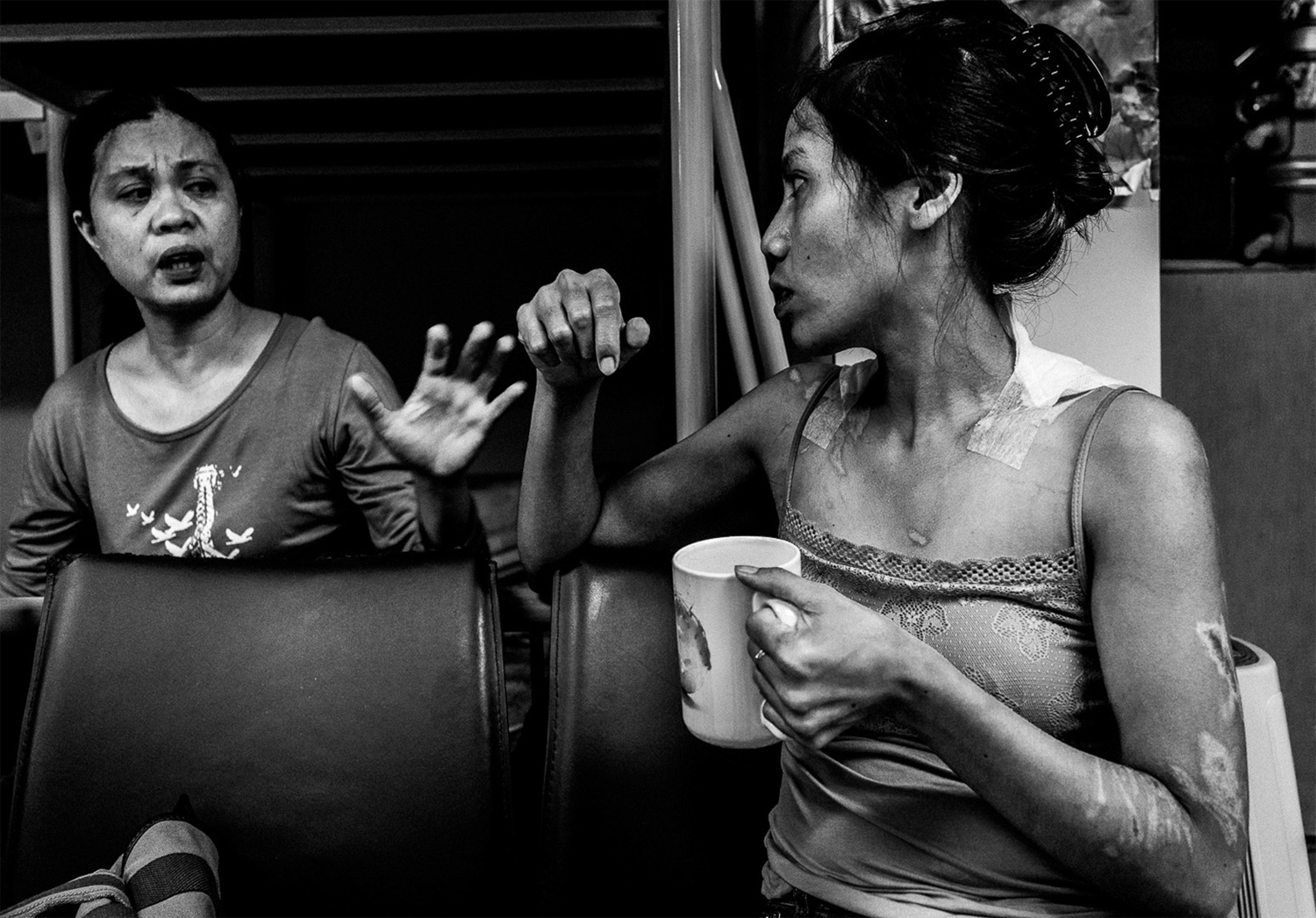Occasionally, though, a major jolt shakes the whole of Hong Kong out of its distracted stupor over the issue. As happened in the case of Erwiana Sulistyaningsih, 24 (the slight Indonesian woman portrayed by Bacani in photo 22) whose employer, Law Wan-tung, was jailed for six years after beating her unconscious countless times, punching her so hard that her teeth were fractured, depriving her of food, twisting metal tubes from the vacuum cleaner in her mouth, and other violent criminal acts. Law’s lawyer, Graham Harris SC, offered this defense of his client: her acts were not “one of the very worst of its kind [sic].” He recalled the case of Chan Mei-ying, a 51-year-old woman who was jailed for four months for scorching her helper’s hands with a hot iron, after she messed up a blouse. Doubtless also on his mind was the case of Tai Chi-wai and his wife Au Yuk-shan, who are serving a lengthier jail term for attacking their domestic helper with bicycle chains, hot irons, paper cutters, shoes, and hangers.