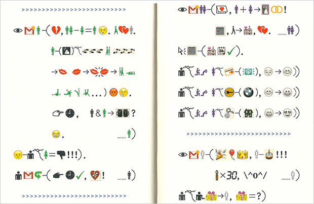 Indeed, if this plot summary sounds slim, consider this: From Point-to-Point is “written” without a single word—at least as they are traditionally defined. Instead, it is composed with hundreds of icons, or pictograms, that Xu has been collecting for years. Where Book from the Sky can be read by no one, Book from the Ground can be read by any one. It is, in other words, a remarkable effort to create a universal form of written communication that transcends cultural, linguistic, class, and educational backgrounds. In Xu’s words, “The illiterate can enjoy the delight of reading just as the intellectual does.”