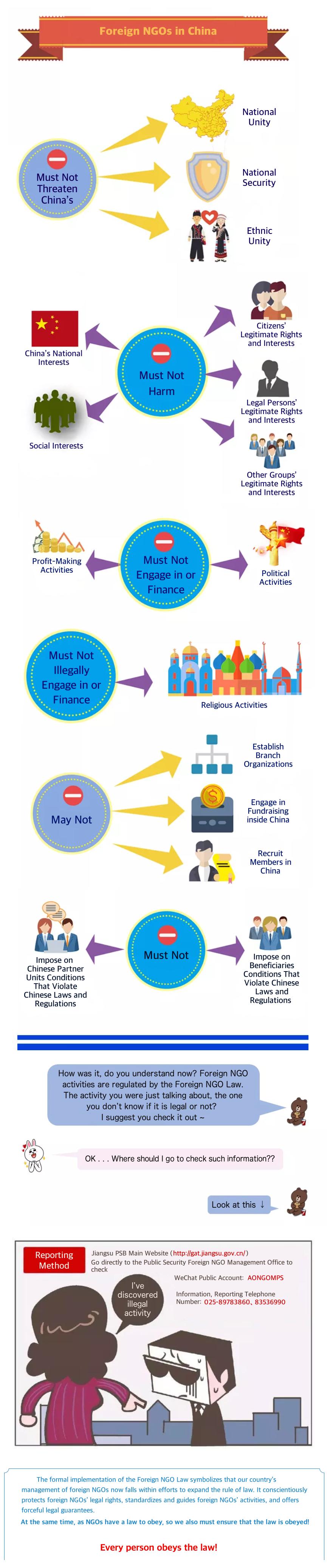 The MPS forwarded a WeChat post by the Qidong City, Jiangsu Province Public Security Bureau that featured a cartoon and infographic about the Foreign NGO Law. The infographic offers a general overview of the law, such as: what defines a foreign NGO, what sectors foreign NGOs are able to work in, who registration and supervising authorities are, what paperwork is required to register or file, and what foreign NGOs are not permitted to do. As many of the details of registration and filing have been covered on this site, The China NGO Project has only partially translated the graphics, focusing on the sections outlining proscribed activities and on how Chinese citizens should question and report on suspicious foreign NGO activities.