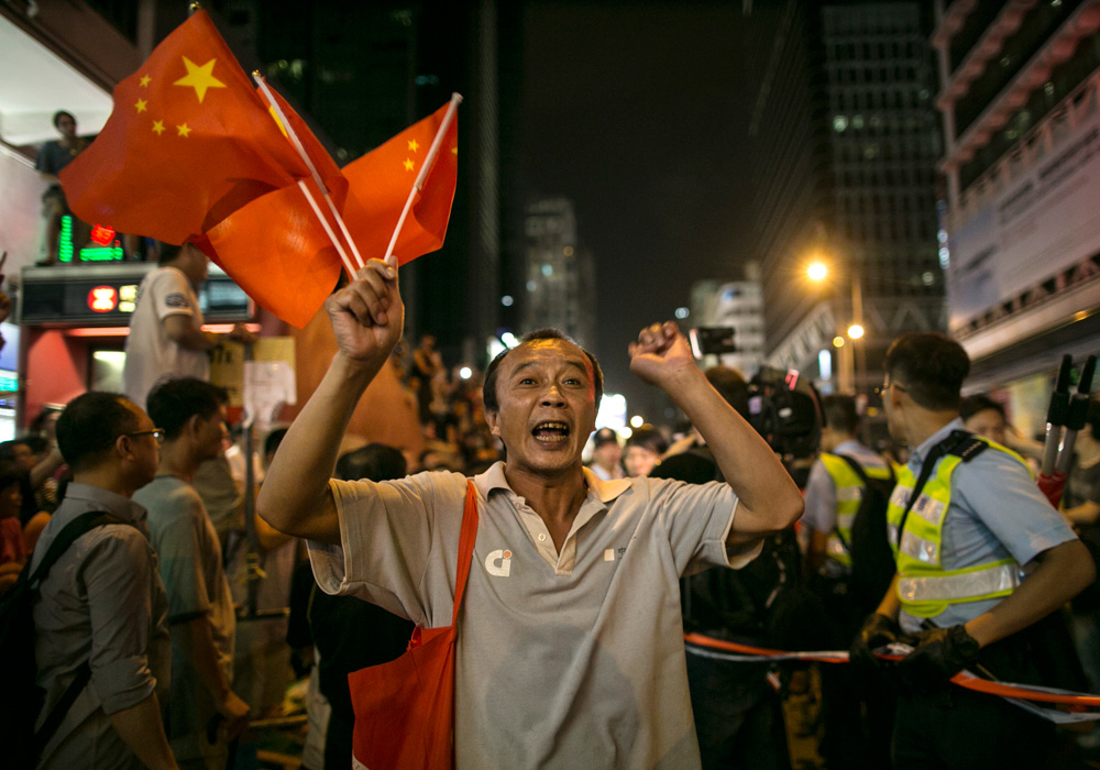 A resident of Kowloon holds flags for the People's Republic of China while he screams at student democracy protesters to “get out,” in the Mongkok neighborhood, October 3, 2014 in Hong Kong.