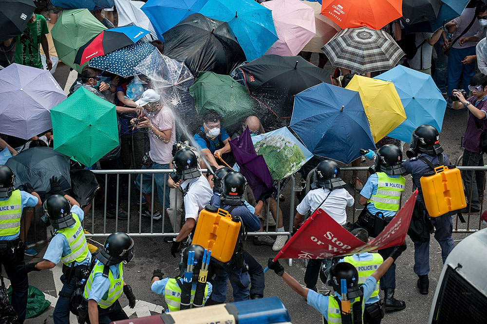 Protesters clash with riot police on September 28, 2014 in Hong Kong. Thousands of people took over Connaught Road, a major Hong Kong thoroughfare, to protest Beijing’s framework for electoral reform in the city.