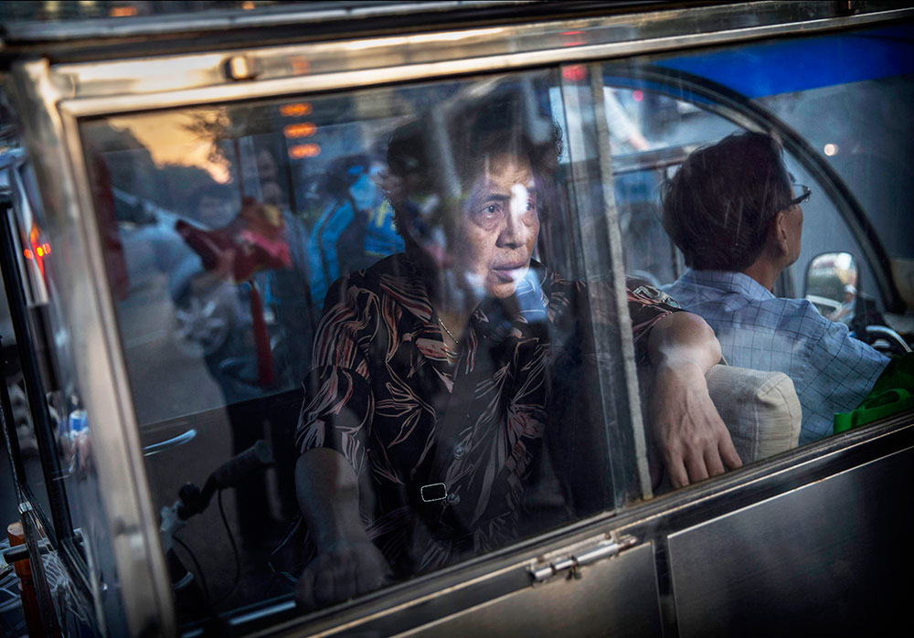 A woman waits in the back of a three-wheeled taxi stuck in Beijing traffic during rush hour on September 17, 2014.