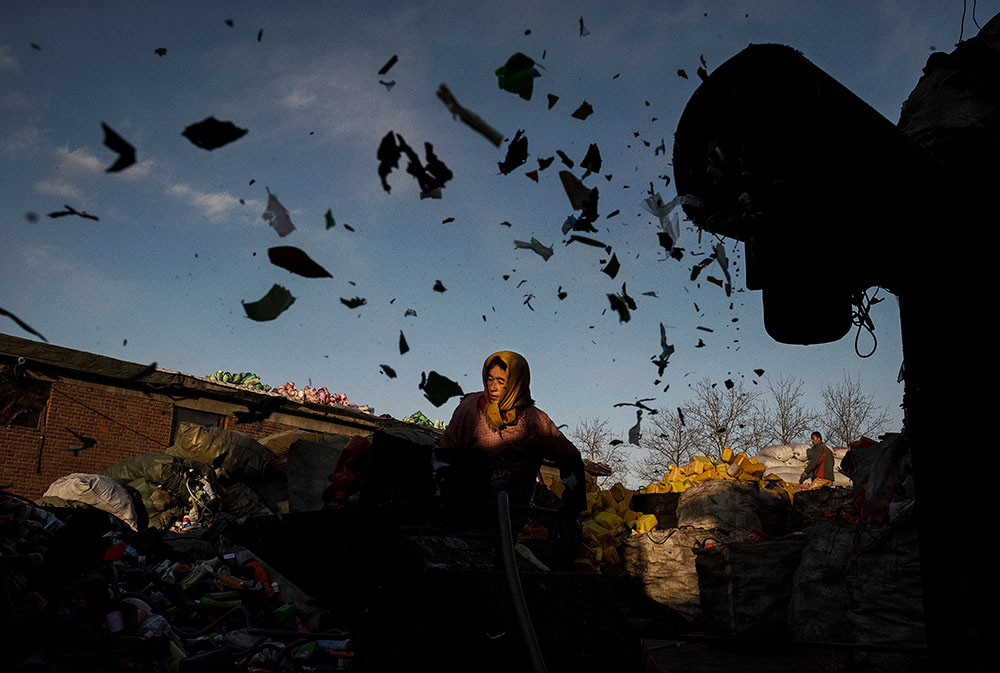 A Chinese laborer loads a machine with plastic as it is chopped into small pieces before being recycled in Dongxiaokou village on the outskirts of Beijing. The village is made up mostly of families of poor migrant workers who have come from surrounding provinces and are some of the tens of thousands of scrap peddlers surviving on recycling goods collected in China’s capital. China is the world’s biggest generator of solid waste and as the country’s population and economy continue to grow the peddlers are integral to the waste and recycling management system in major cities.
