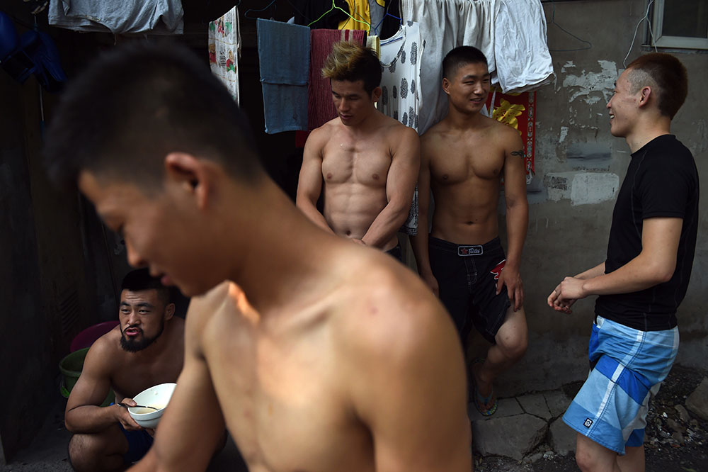 Mixed martial arts fighters, from left, He Nannan, Li Peng, Wu Haotian, Chao Lumen, and Hu Rige stand outside the house they share in Beijing. They are among China’s growing ranks of MMA fighters. Many hope to punch their way out of poverty by reaching the sport’s higher levels.