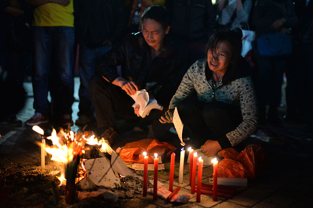 Mourners burn paper money and incense at the scene of a knife attack at the main train station in Kunming, Yunnan province. Chinese police blamed Uighur separatists. Both Beijing and Washington have described the attack in Kunming which killed 29 people and injured 143 as terrorism.