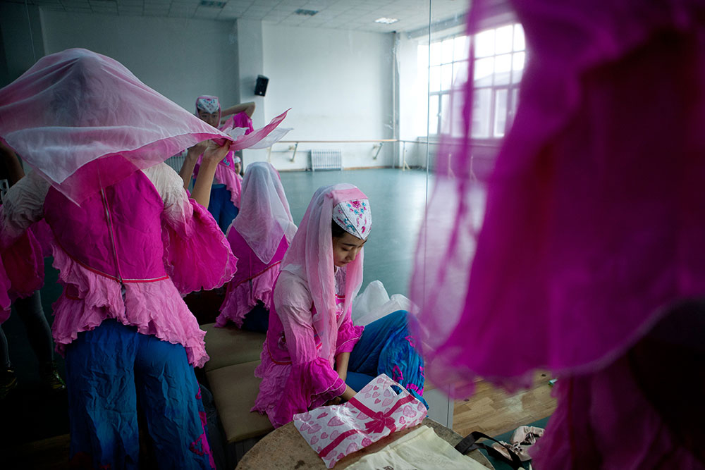 Girls prepare for a rehearsal of a traditional dance of the Hui ethnic group in a class at Ningxia Arts School, in Yinchuan, Ningxia. They have been training for five years.