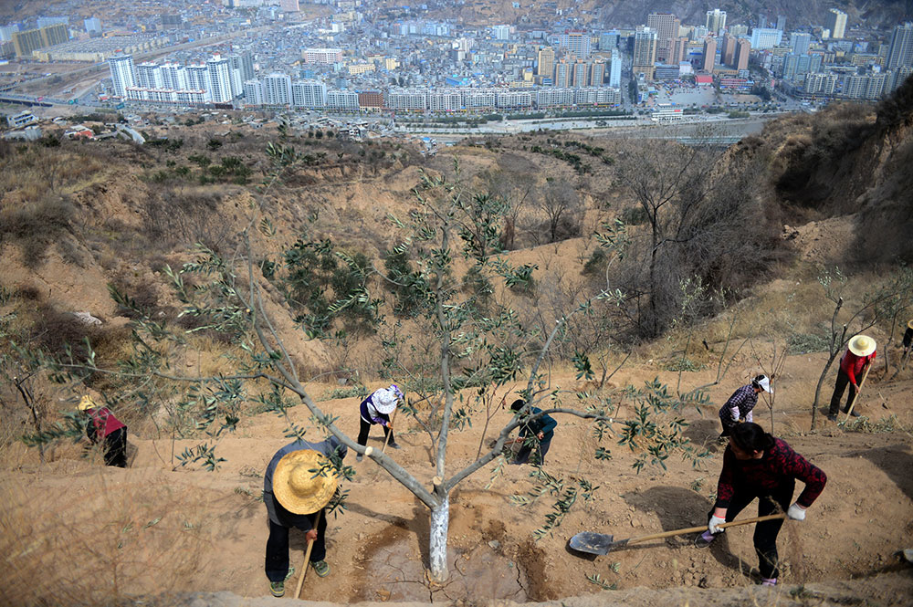 Farmers plant olive trees on the outskirts of Longnan City, Gansu province, an olive growing region in China.