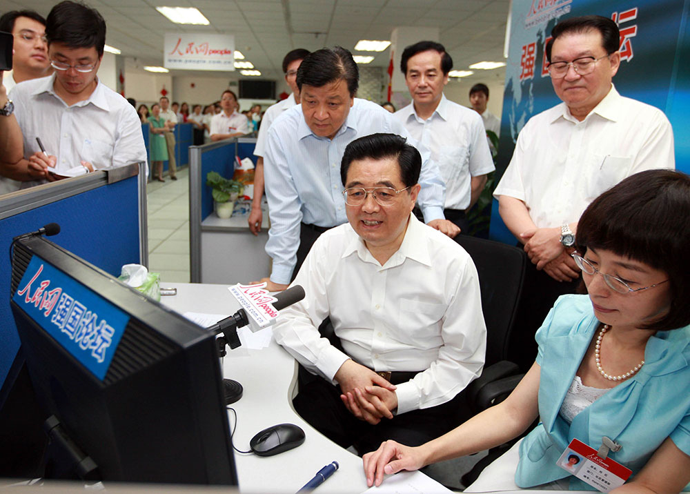President Hu Jintao pays an official visit to the People’s Daily on June 20, 2008, just weeks after the devastating Sichuan earthquake, and pushes the new media policy concept of “public opinion channeling.”
