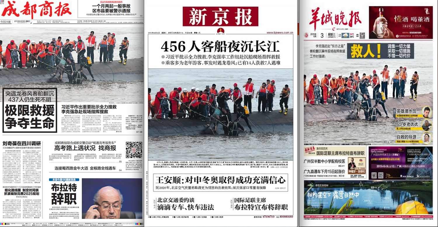 Three commercial newspapers on June 3, 2015. Same images, same content.