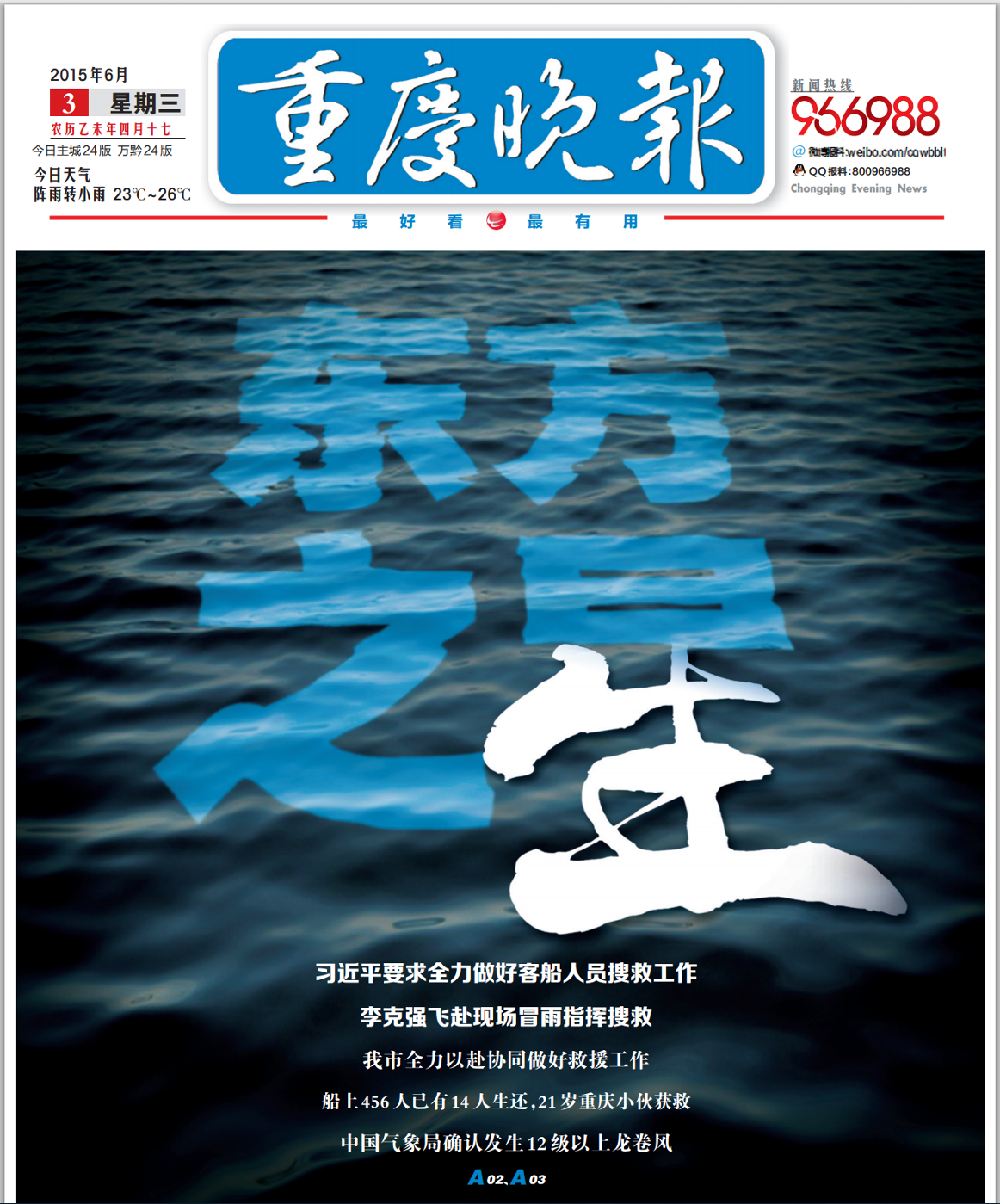 The June 3, 2015 edition of the Chongqing Evening News departs noticeably in its front-page design from other papers across the country.