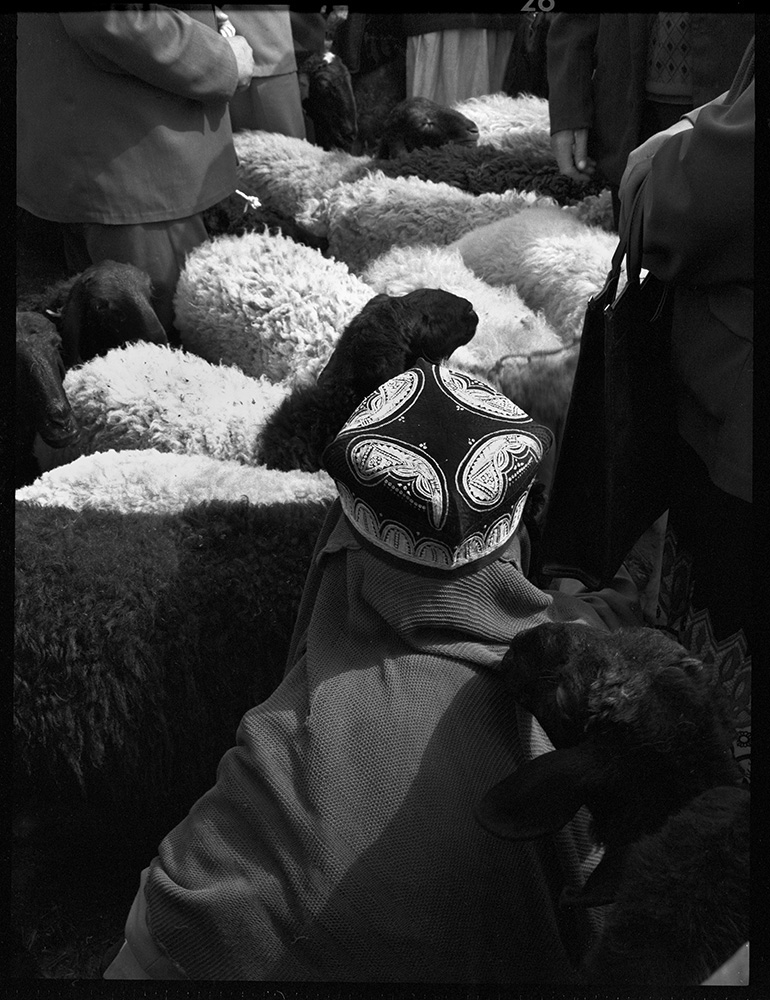 A Uighur woman surrounded by sheep at Kashgar livestock market, 1995.