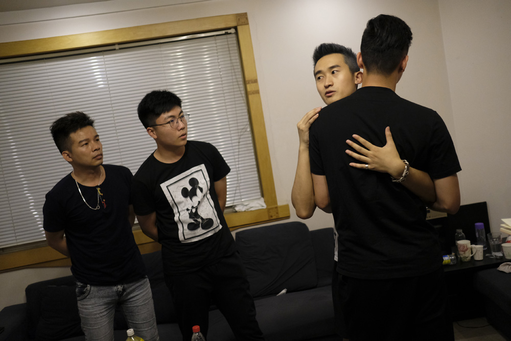 Fei Ge teaches a class about how to steadily escalate physical contact with women, a PUA method called “Kino,” October 4, 2016.
