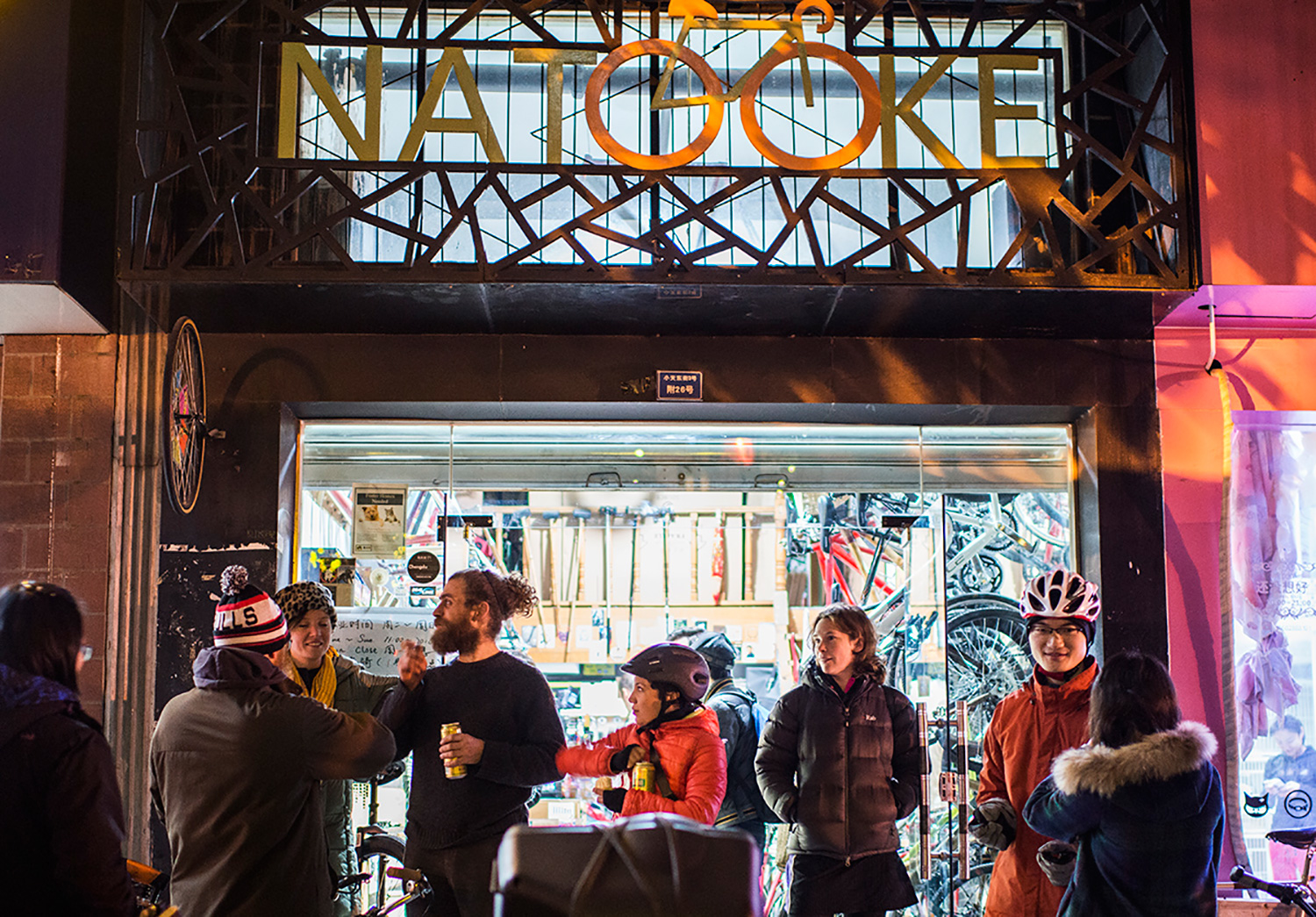 A group of riders gathers in front of the shop before a night ride through the city.