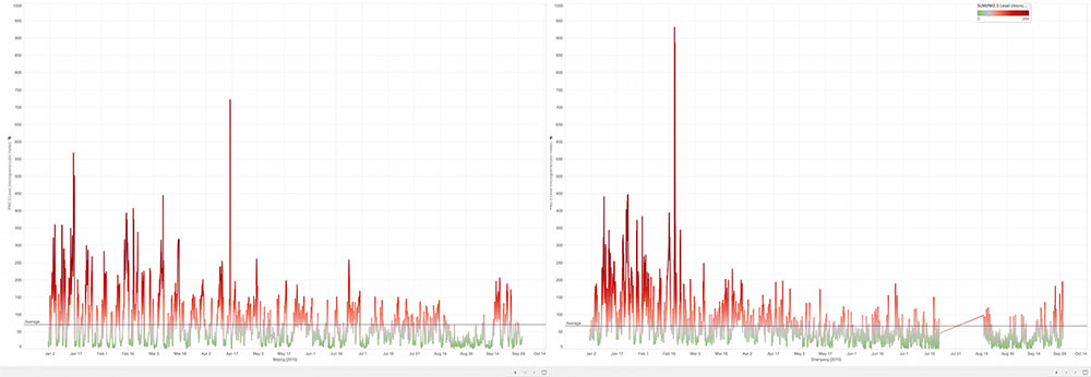 A comparison between Beijing and Shenyang (right) for the period January-September 2015. Shenyang's past winter was particularly bad, worse than Beijing's, also had a spike that went over 900. But on average, Beijing's PM2.5 level is still slightly higher, more polluted, than Shenyang.
