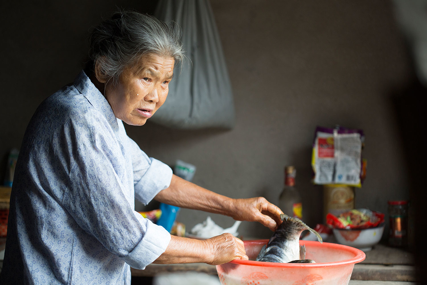 One of the last remaining residents of the village of Wu Ying prepares fish for a meal. After 2009, when new construction on the dam brought the reservoir level almost 50 feet higher, only two houses remained in this “ghost village.”