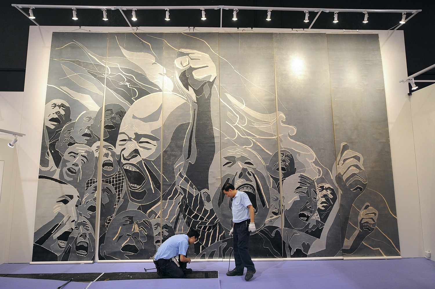 Workers prepare giant woodblock-print hanging scrolls by artist Fang Lijun to be auctioned by Sotheby’s, in Hong Kong, April 5, 2008.