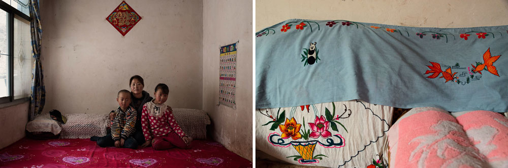 Chen’s husband is a migrant worker in southern Gansu province, four hours away by bus from the family home. He works constructing electric lines in the countryside and returns home every two months. They started building a new concrete house a year ago. Chen says the old house, which was made of mud, was warmer, but she says she is happy with the new one. The construction of the house is not finished, so for now they are living in just one room. Chen met her husband in Lanzhou, the capital city of Gansu province, where they were both migrant workers. She then moved to her husband’s village, where she is taking care of their children.
