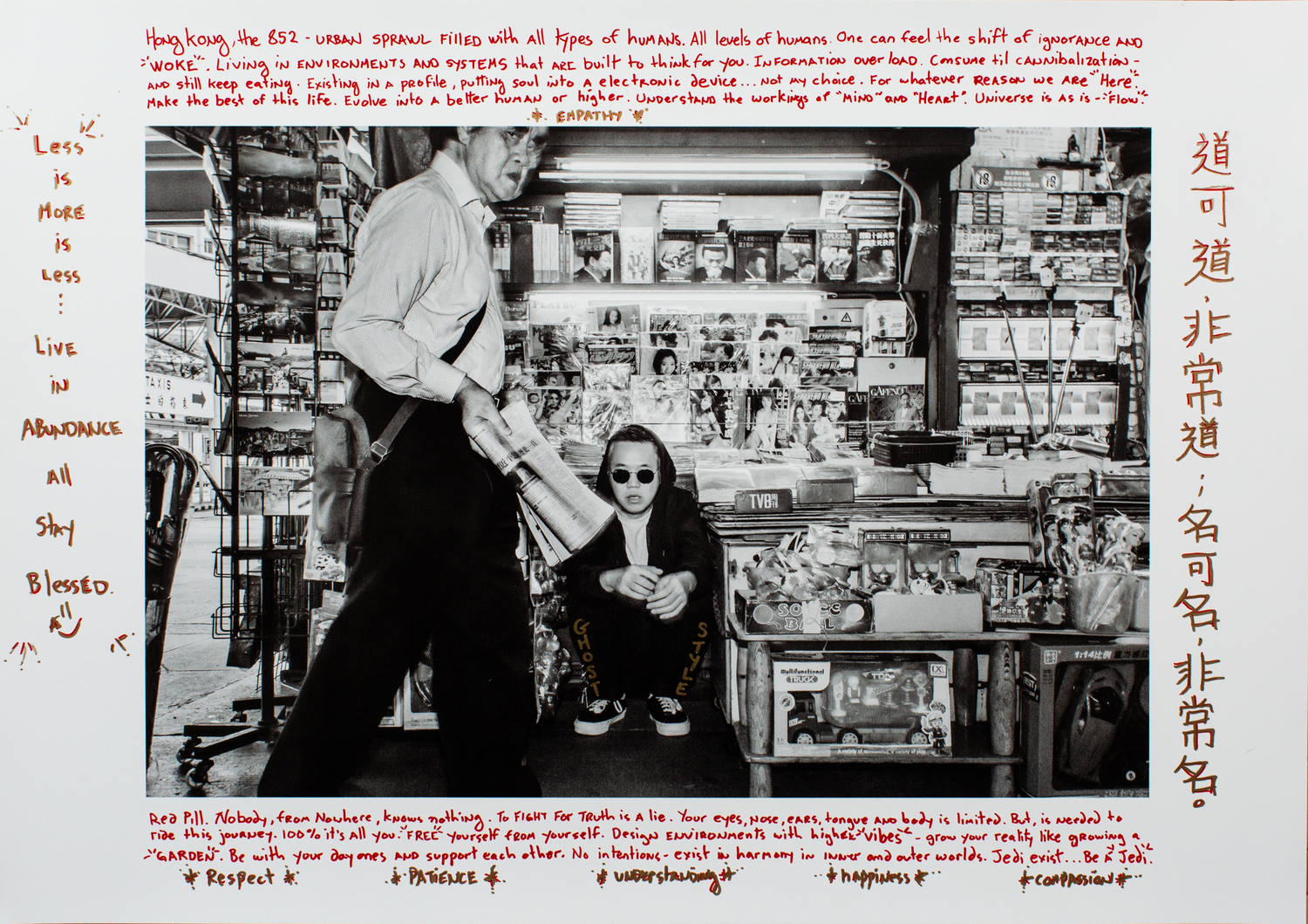 Hong Kong, the 852 - URBAN SPRAWL FILLED with all types of humans. All levels of humans. One can feel the shift of ignorance AND “WOKE”. Living in ENVIRONMENTS AND SYSTEMS that are built to think for you. Information overload. Consume til cannibalization—and still keep eating. Existing in a profile, putting soul into A electronic device . . . not my choice. For whatever REASON W ARE “Here”. Make the best of this life. Evolve into a better human or higher. Understand the workings of “MIND” AND “HEART”. Universe is as is—“Flow”.