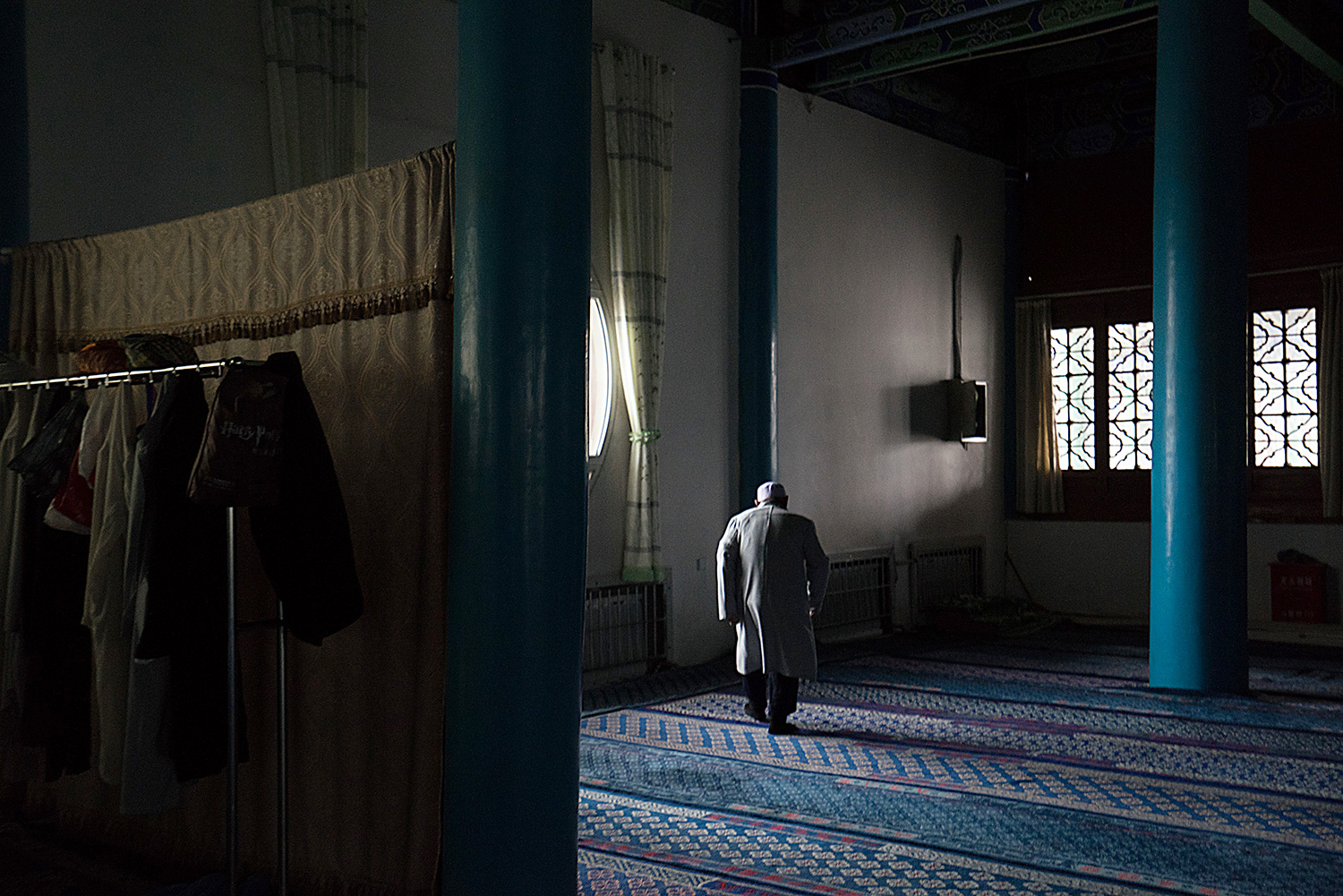 An observant man walks to the corner of the main prayer hall of Najiahu Mosque before mid-day prayer.