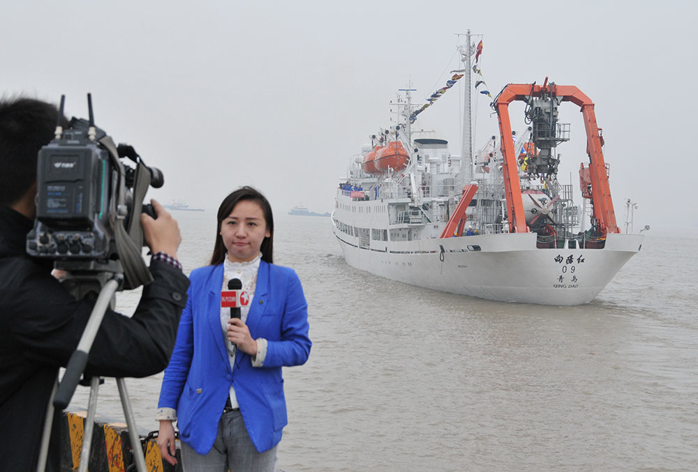 A journalist prepares to report on China’s manned submersible, Jiaolong, with its carrier, Xiangyanghong 09, as they set sail from Jiangyin City, Jiangsu province, November 25, 2014.