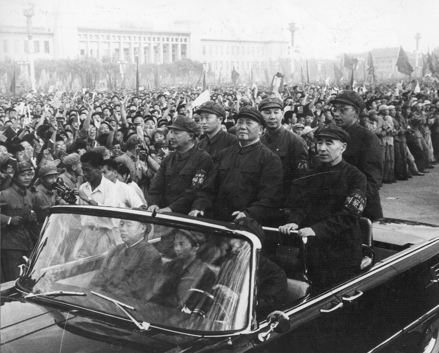 Mao, accompanied by his then second-in-command Lin Biao, passes along the ranks of revolutionaries during a rally in Tiananmen Square, 1966.