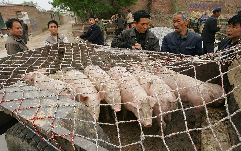Potential buyers survey pigs at a livestock market on the outskirts of Renqiu city, Hebei province.