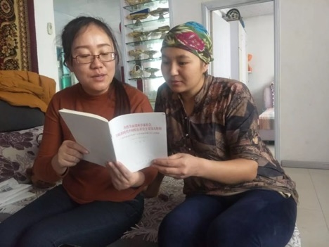 A sent-down state worker reads Xi Jinping’s report for the 19th National Congress of the Chinese Communist Party to her Uighur “relative.” The image was posted by the Xinjiang Communist Youth League on WeChat.