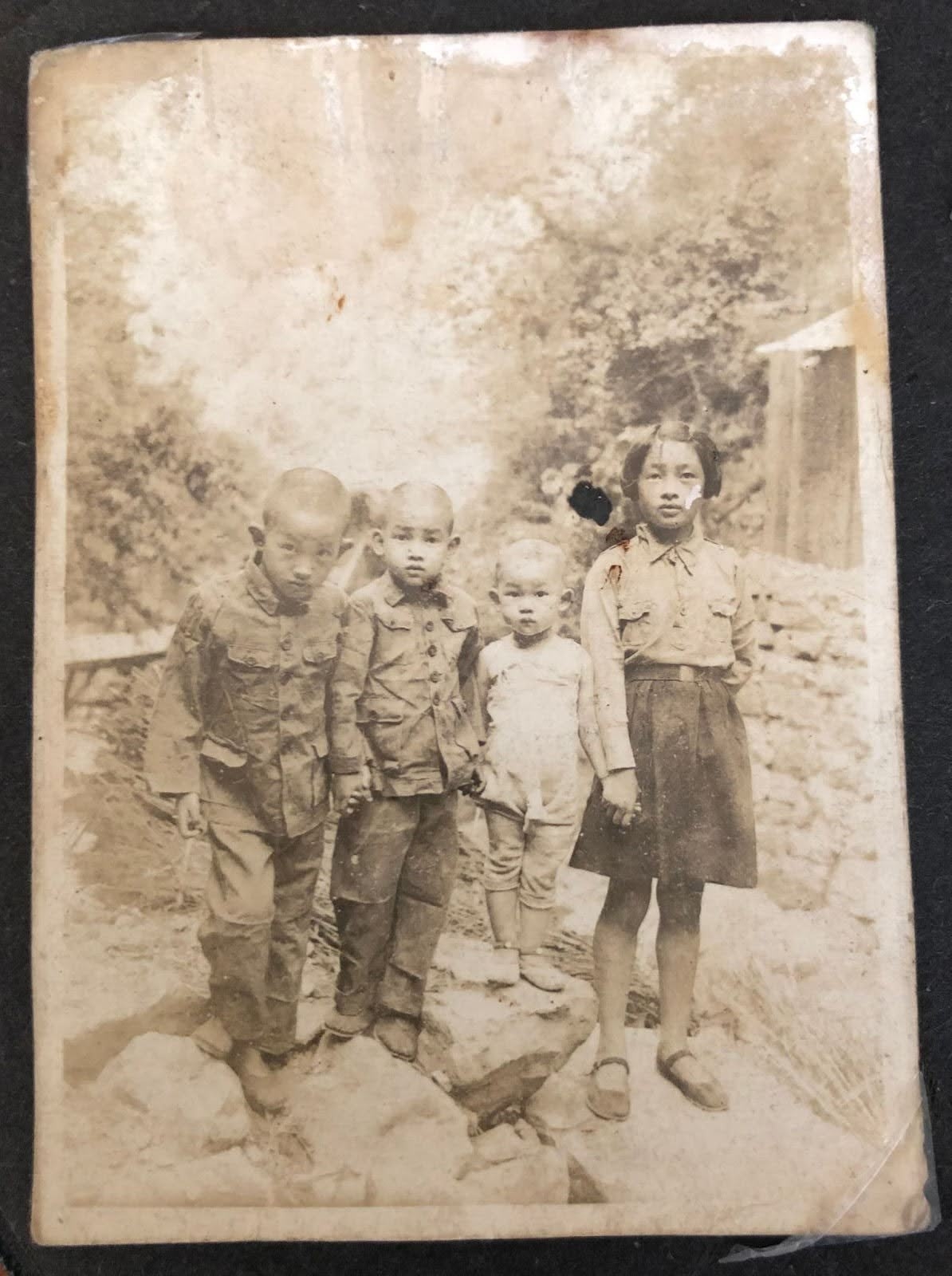 The author’s mother (right) with her three younger siblings in Badong, Hubei, 1941. The siblings stand near a mountain cave which hide the KMT military factory headed by the author's grandfather during the Sino-Japanese War. Left to right: Hangsheng, Lusheng, Dongsheng, Hansheng.