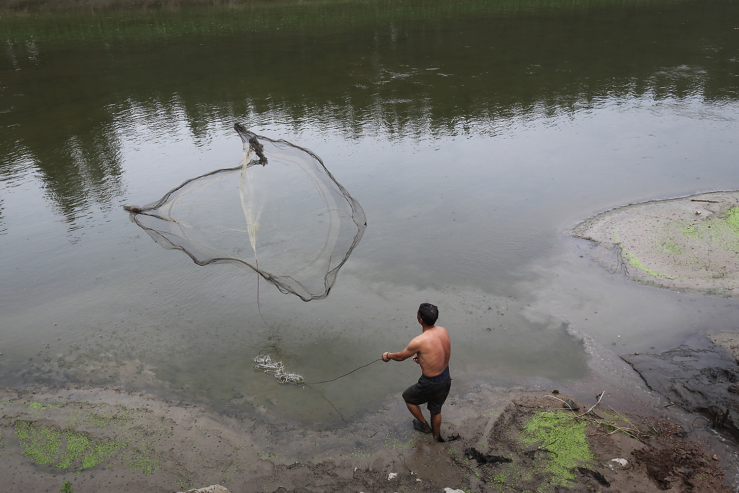 Workers fish on the Xiaoqing River during their lunch break. ‘These little fish can take a lot,’ said one worker. ‘Ordinary pollution won’t kill them.’