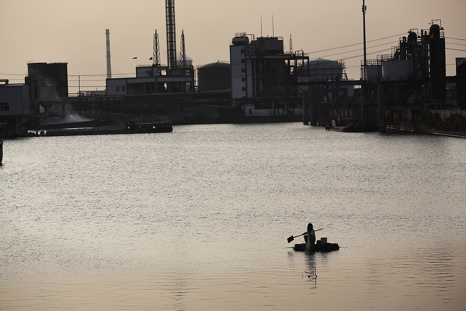 A villager works with her fishing net and shovel from a small boat on the Fushan River.