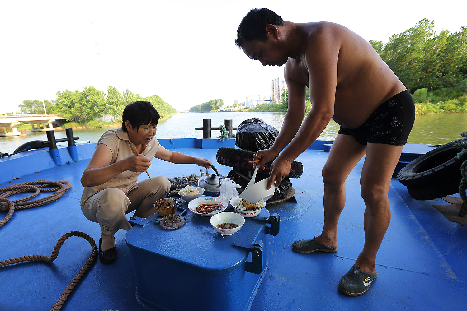 A couple pauses to eat a meal on a cargo ship as they wait for assignments to transport chemicals on the Fushan River.