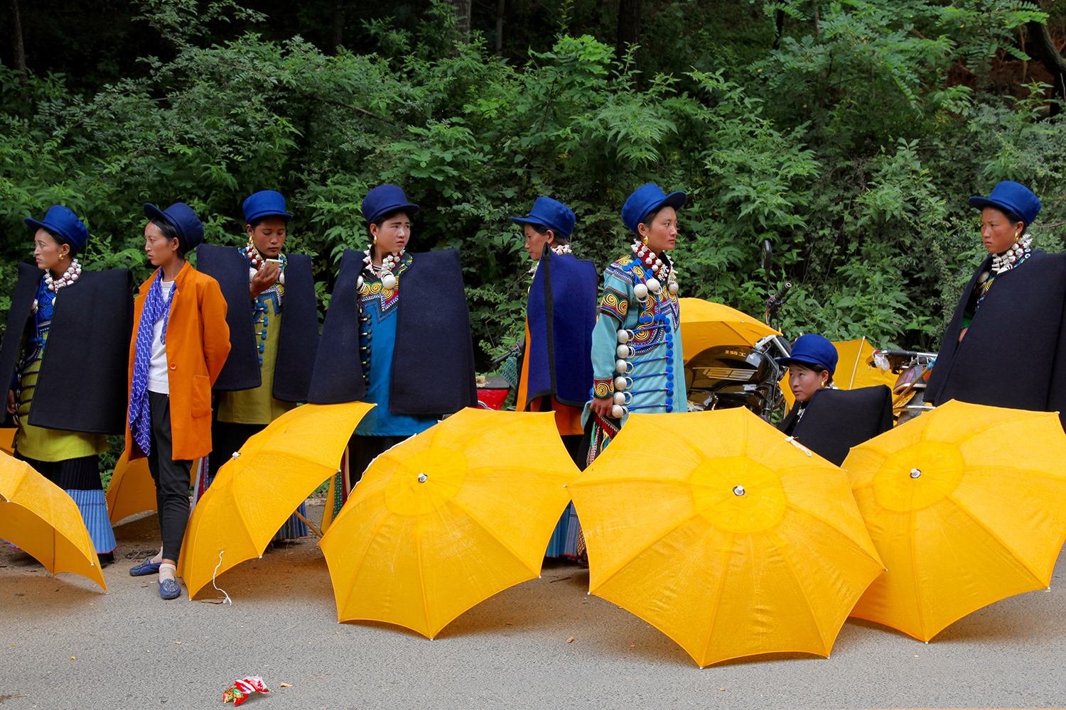 Beauty contest participants rest between rounds at a Torch Festival celebration, July 2016.