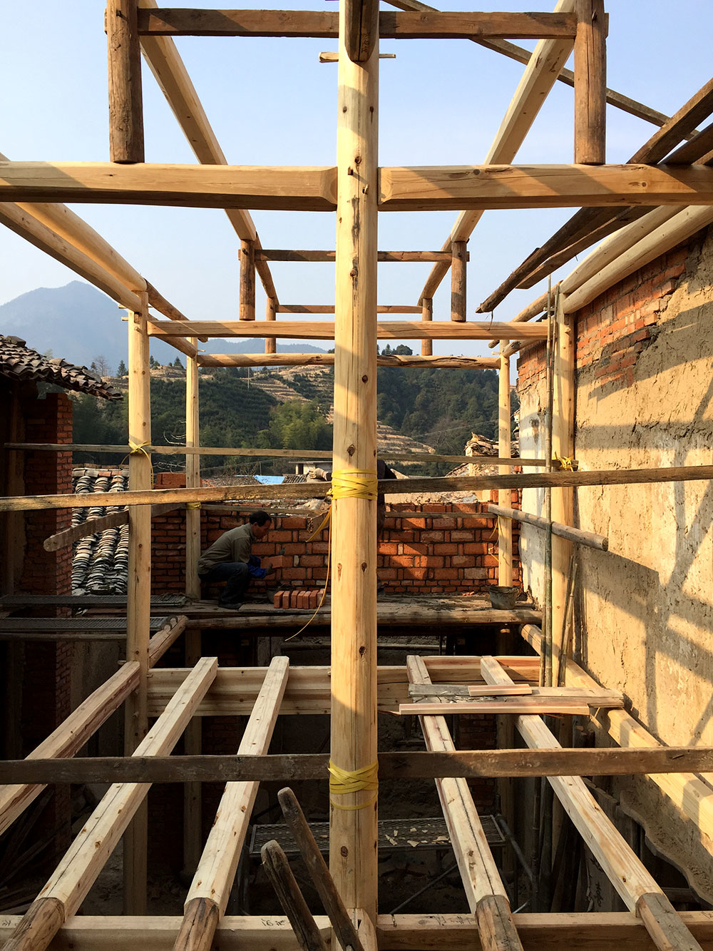 In the early stages of project work, a building in Pingtian Village (平田村) shows the exposed wood beam construction designed by a team of architects from Tsinghua University, University of Hong Kong, and Chinese Central Academy of Fine Arts. Because earthen-walled construction doesn't support much weight, architects are reconstructing some of the buildings with new wood frames.