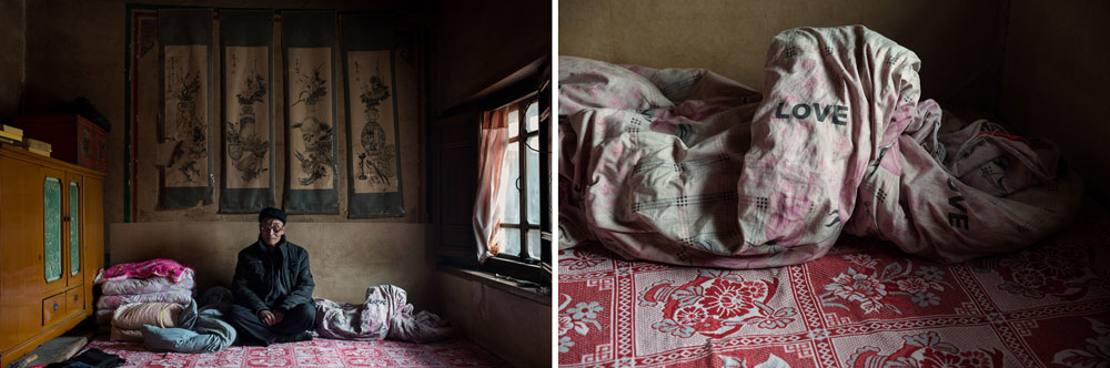 During the Great Leap Famine of the early ’60s, Wang’s nine siblings left the region in search of food. He never saw them again. He went two weeks without eating anything. Nowadays, he survives by producing honey from four beehives. A comforter on Wang’s kang has the word “Love” printed on it.
