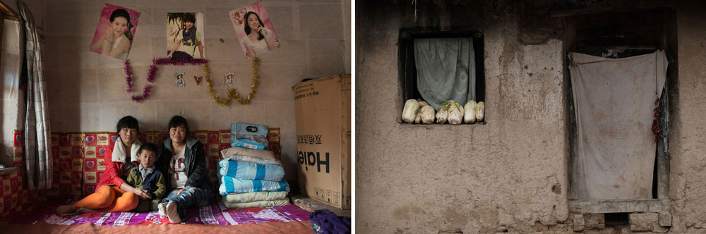 Lei’s mother works more than 600 miles away in a supermarket in Xinjiang where she can earn more money. Her sisters, Yandi and Yanxia, care for their little nephew. Both of their parents have passed away. They will soon move to a new house nearby. Outside, cabbage, at right, dries on a window sill in their courtyard.