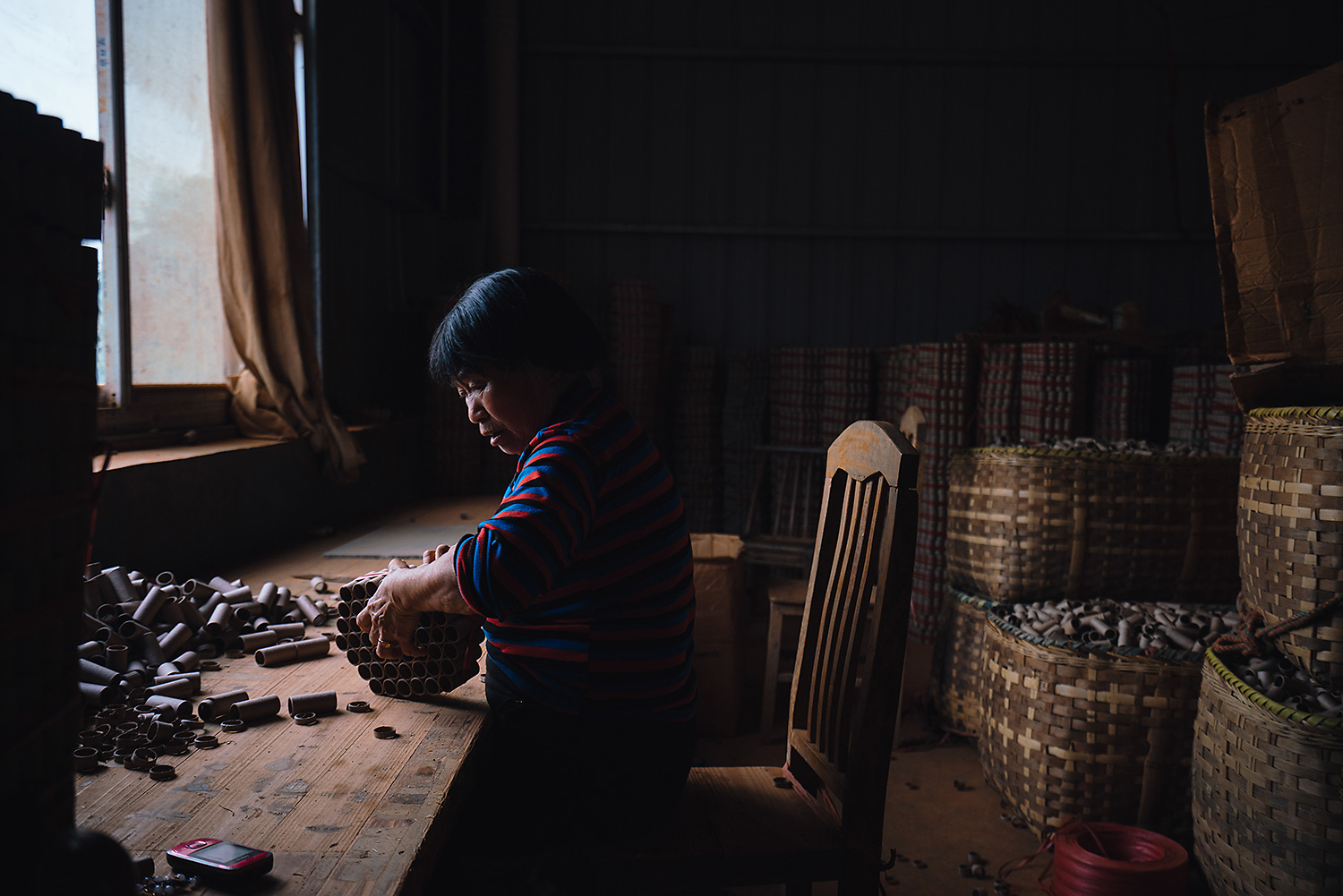 A worker wraps firework shells at the Wanle Fireworks Factory, Bixi village, May 11, 2016.