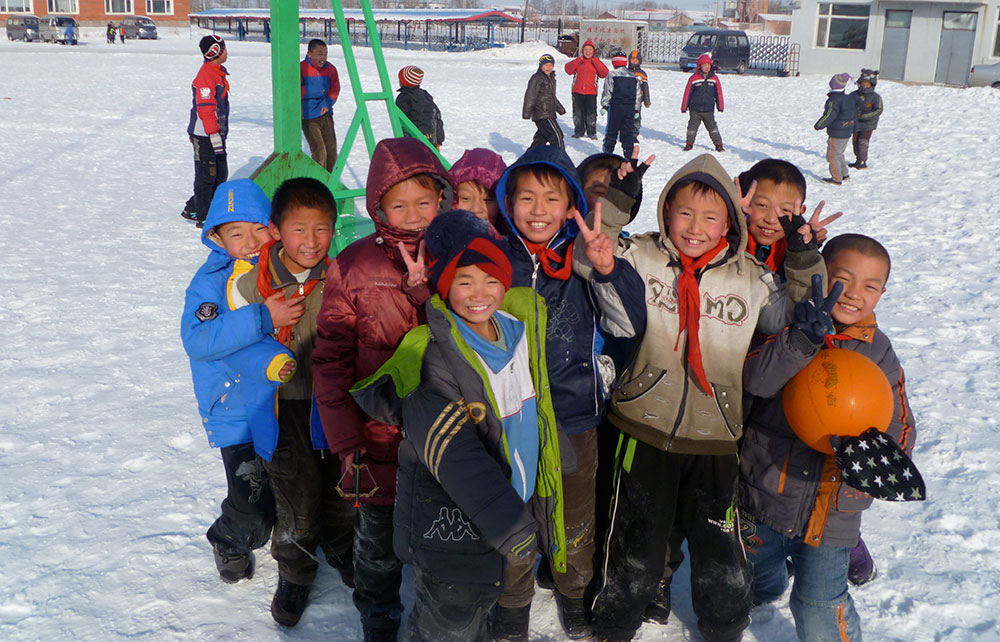 Students pose for a photo by the author during school recess in Da Huangdi (Wasteland), January, 2013.