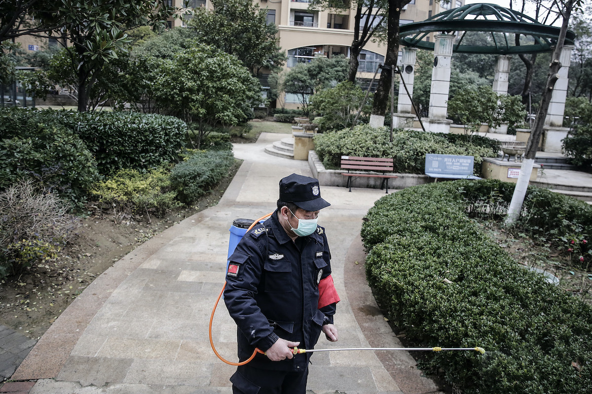 A security guard sprays disinfect in an outdoor community space in Wuhan, January 23, 2020.