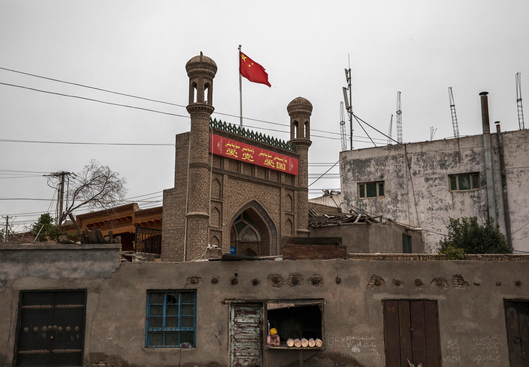 A P.R.C. flag flies over a mosque recently closed by authorities, and on which hangs a banner with the slogan “Love the Party, Love the Country,” in Kashgar Old Town, June 28, 2017.