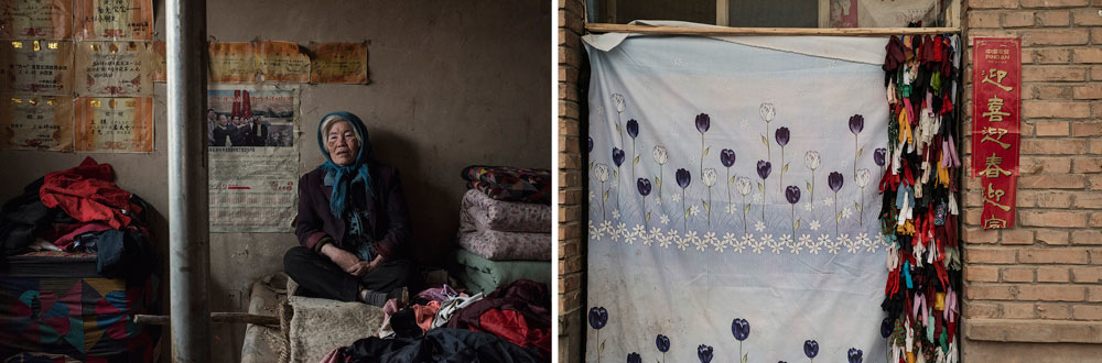 Zheng sits on her broken kang. Eight years ago, she and her family were relocated from their village 30 miles away. The reason given was desertification. She says that the land they were given is no better than what they left behind, and says the houses built by the government for the relocated farmers are poorly constructed. “When I had to leave, I cried so much I thought I would become blind.” On the wall behind her are her grandson’s school diplomas and awards, as well as a four-year-old calendar with a picture of then Prime Minister Wen Jiabao visiting her region when he made a pledge to fight desertification.