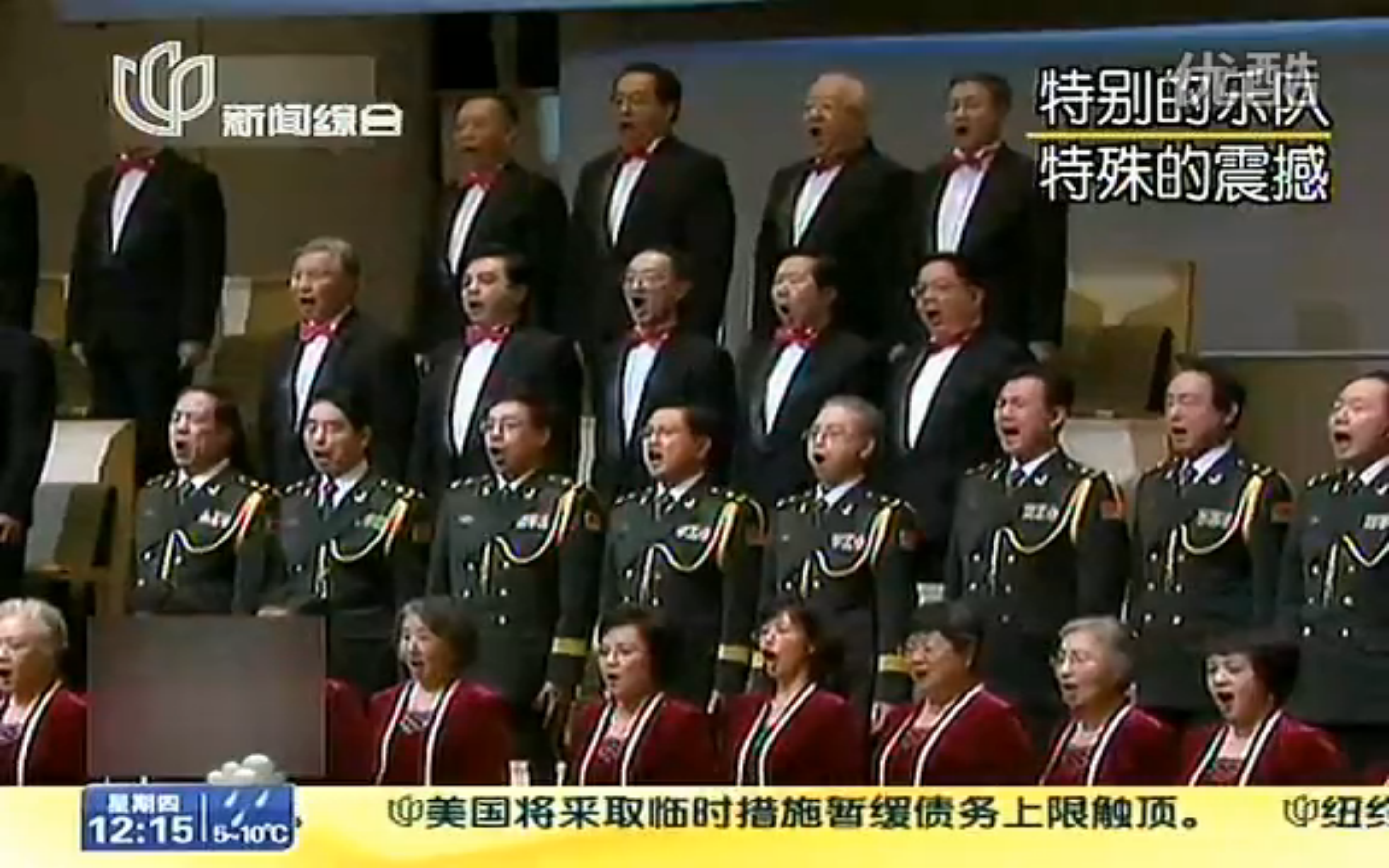 The Three Highs began to rehearse in July and in August and gave its first internal performance in Beidaihe, the Communist Party’s seaside retreat. Because of distance and work obligations, orchestra members were only able to meet in various cities every few weeks and come together as an ensemble even more sporadically. Since many musicians had not played their instruments in decades, they felt obliged to practice day and night; Chen Jiabao, chairman of the standing committee of the Nanjing People’s Congress and a flutist, reportedly practiced so much that the tendons in his hands became inflamed. Members of the chorus were asked to sing Beethoven’s “Ode to Joy” in its original language and thus had to study German; some singers were unfamiliar with five-line staff notation and so had to pencil in the numeric musical notation (jianpu) commonly used by choruses in China.