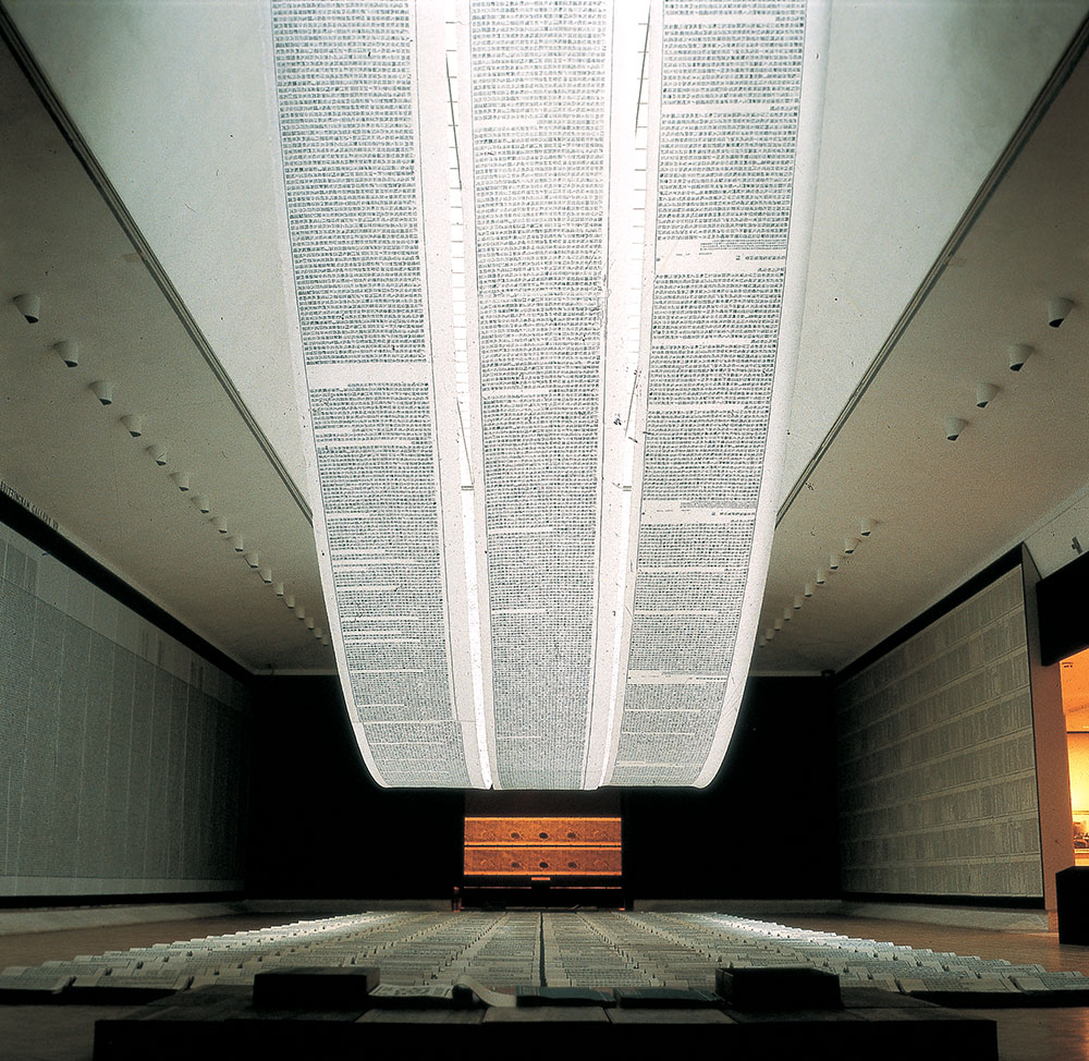 How strange it must have been to walk down a familiar street with walls now covered in dazibao and seeing the same safe sentiments repeated again and again. The words didn’t mean anything other than a signal that the writer was committed to the cause, or at least eager to avoid being singled out. When you first see Xu Bing’s extraordinary “Book from the Sky,” you can’t help but pause and think of a teenage Xu’s memories of dazibao. There are words sweeping down from above on banners, rising from the floor in stacks of books, hemming you in between completely covered walls. It’s ethereal and claustrophobic. If you don’t read Chinese, you stare at the waves of pictograms and wonder what they mean. If you do read, you soon realize that they mean nothing at all, at least not on their own. The script consists of around 4,000 invented characters, roughly the number that a Chinese schoolchild learns before being considered literate.