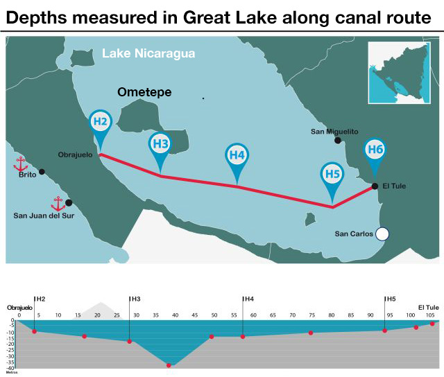 In Managua, Dong said that the Canal would measure 230 to 250 meters (755 to 820 feet) wide, and that its depth would range between 27.6 and 30 meters (91 and 99 feet). Immediately, Nicaragua’s scientific community intensified its alarm over the future of the Great Lake, Latin America’s second largest. The reason: its scant depth.