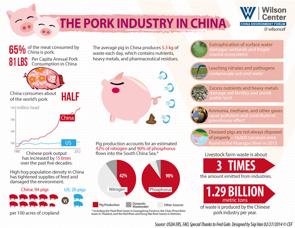However, as the graphic produced by the U.S.-based Wilson Center's China Environment Forum reveals, the costs of rising meat and intensive pig production can no longer be ignored.
