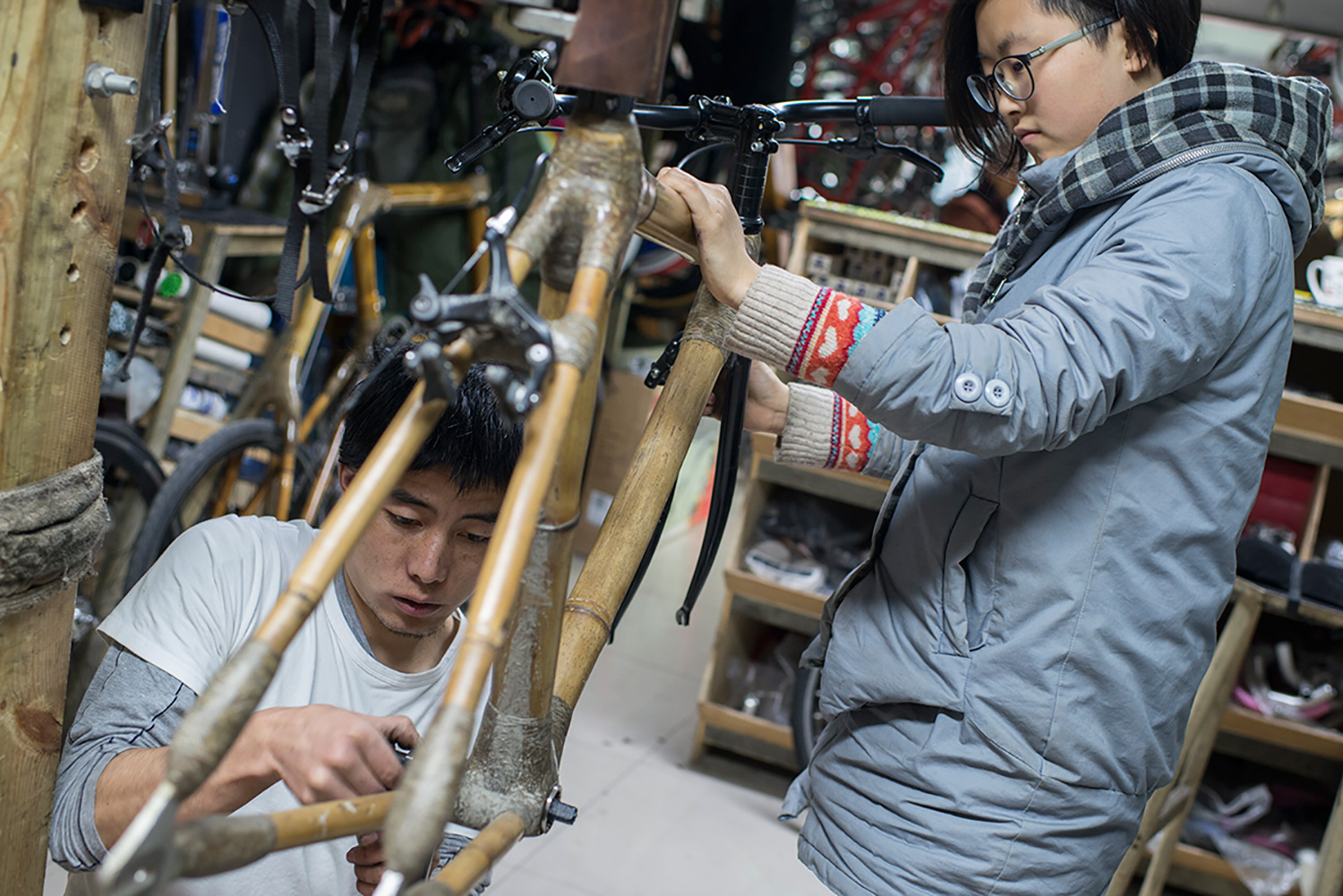 Upstairs on Natooke’s second floor, Jacob’s partner, co-owner Larry Adamson, is rummaging through stacks of grasses and bamboo tubes. He and Jacob call the shop’s bamboo initiative Source Cycles. Each bike is built by hand using cured and treated bamboo poles, hemp-like grass called huangma from western Sichuan, and hours of patient grinding, tacking, gluing, and mitering. It takes a special pair of obsessive tinkerers to survive the long jaunt through the labyrinthine world of Chinese manufacturing and the confusing taxonomy of bamboo species and epoxy recipes to come out the other end with beautiful, functional bicycles that attract buyers from Tianjin to Sydney.