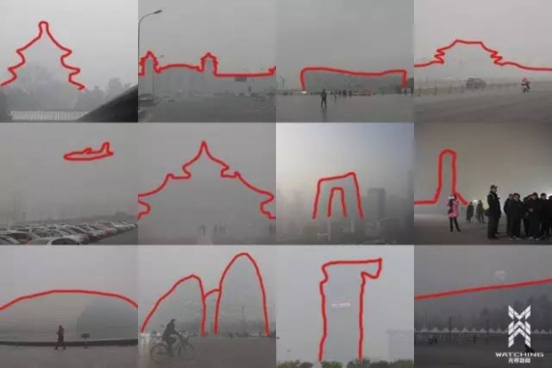 The creative WeChat post “Beijing Smog: Use Your Imagination When You Go Out,” shows a series of photos of smog-plagued Beijing, with all the visibly missing landmarks photoshopped in with a red outline—including the Temple of Heaven, the Bird’s Nest Olympic stadium, the Monument to the People’s Heroes in Tiananmen Square, the “Egg” (National Center for the Performing Arts), the CCTV Tower, and even an airplane.